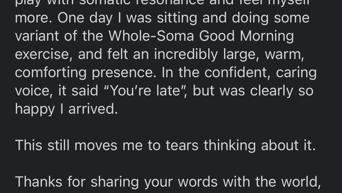 River helped me to process a lot of complex emotions in ways that both echoed and subverted the more typical "how does that feel in your body?" therapeutic process. I appreciated that he was able to roll with my own complex, multi-modal approach to stuff - bouncing between somatic and symbolic and cognitive and mythic and etc as parts of an underlying rhizome.