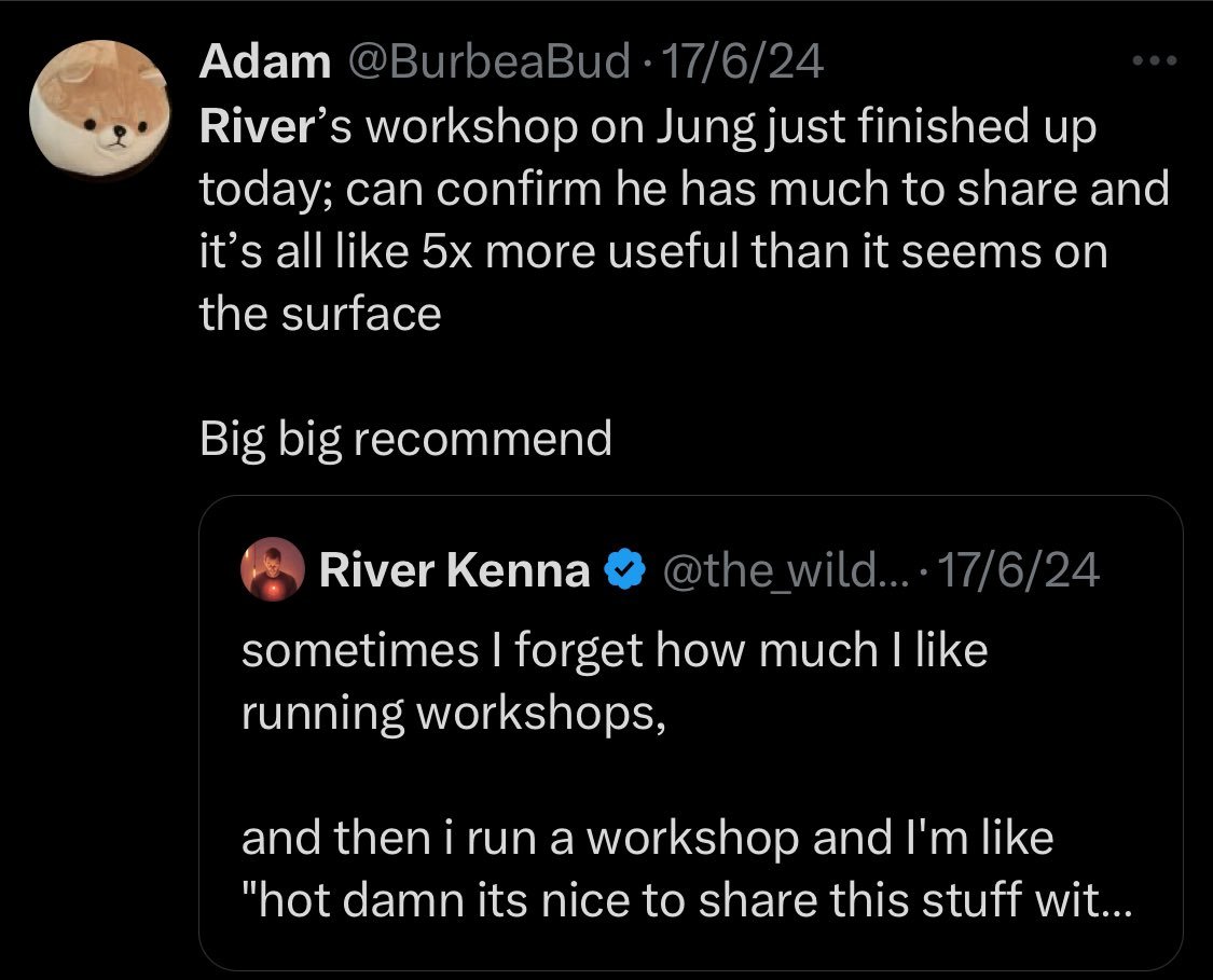 I think what River excels at is creating a space where certain kinds of things can come up and be welcomed and explored - it's a sort of safety, but not simply safety because he's also opinionated and human and there is a sort of edge in some ways to the safety that in some ways made it even more helpful than a more sterile "this is a safe space" sort of thing?